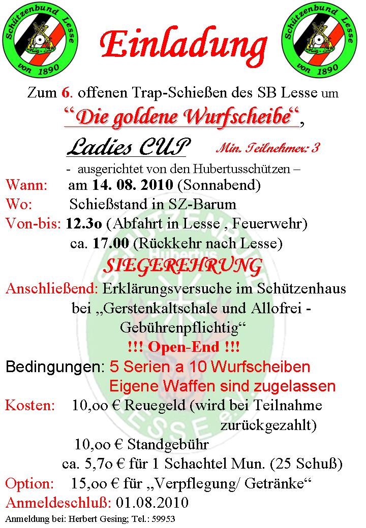 26.12.06 An dieser Stelle möchte ich allen Besuchern unserer Homepage erstmal ein frohes Weihnachtsfest und einen guten Rutsch ins neue Jahr wünschen. Wer noch nicht weiß, was er nächstes Jahr hier in Lesse so unternehmen kann, kann sich im Veranstaltungskalender 2007 genauestens informieren. Euer Webmaster 15.11.06 Heute gibt es eine Einladung vom Schützenbund zum Trapschießen. Das Ganze findet am 02. Dezember wieder in Barum statt. Näheres erfahrt Ihr hier. Euer Webmaster 11.11.06 Lieber spät als nie! Heute gibt’s nach etwas über zwei Jahren mal wieder was Neues von der FFW-Lesse. Außer dem überarbeiteten Text sind mir auch noch neue Bilder zur Verfügung gestellt worden. Außerdem ist der Veranstaltungskalender des Schützenbundes für das Jahr 2007 neu hinzugekommen. Euer Webmaster 16.10.06 Ratet mal, von wem ich diesmal was Neues bekommen habe?? Natürlich von meinem Haus- und Hoflieferanten dem Schützenbund. Neu hinzu gekommen sind diesmal die Termine für die Vereinsmeisterschaften, die Mannschaftsaufstellungen für die Wettkämpfe sowie die offiziellen Trainingszeiten. Euer Webmaster 21.09.06 Nachdem ich Euch beim letzten Mal das 2. offene Trapschießen angekündigt habe, gibt’s heute einen Bericht und die Ergebnistabelle dazu. Euer Webmaster 25.07.06 Endlich mal wieder ein etwas größeres Update. Heute gibt’s immerhin 126!!! Bilder von diesjährigen Schützenfest und dazu noch gleich eine Einladung zum 2. offenen Trapschießen des Schützenbundes am 26.08.2006. Euer Webmaster 05.06.06 Große Ereignisse werfen ihre Schatten voraus. Heute gibt’s hilfreiche Informationen zum bevorstehenden Schützenfest. Die Grußworte unseres Obristen findet Ihr hier und den genauen (zumindest geplanten) Programmablauf hier. Außerdem wurde mir noch freundlicherweise das Siegerfoto vom Maischießen zur Verfügung gestellt. Euer Webmaster 28.05.06 Leider habe ich es vollkommen verpennt, das letzte Wurftaubenschießen an dieser Stelle anzukündigen. Deswegen erstmal ein mea culpa an dieser Stelle. Verändert wurde im heutigen Update die Zusammenstellung des Vorstandes vom Schützenbund. Genaueres erfahrt ihr hier. Euer Webmaster 18.02.06 Es ist mal wieder soweit. Innerhalb der Lesser Schützenschaft werden die Flinten geputzt und zu Hause im Wohnzimmer wird noch mal der richtige Anschlag geübt. Am 25.02. treffen sich die interessierten Wurftaubenschützen zum ersten Trapschießen in diesem Jahr um 13:15 Uhr an der Tankstelle. Auch ich werde diesmal wieder teilnehmen, allerdings mit einer neuen Flinte. Falls es dann diesmal etwas besser klappen sollte, habe ich immerhin die Möglichkeit mein schmachvolles Ergebnis vom letzten Mal auf meine alte Flinte zu schieben. Wenn nicht, sollte ich mich vielleicht doch besser aufs Briefmarkensammeln verlegen. Ach so, bevor ich’s vergesse: Die offizielle Einladung aus den Printmedien findet ihr hier.
